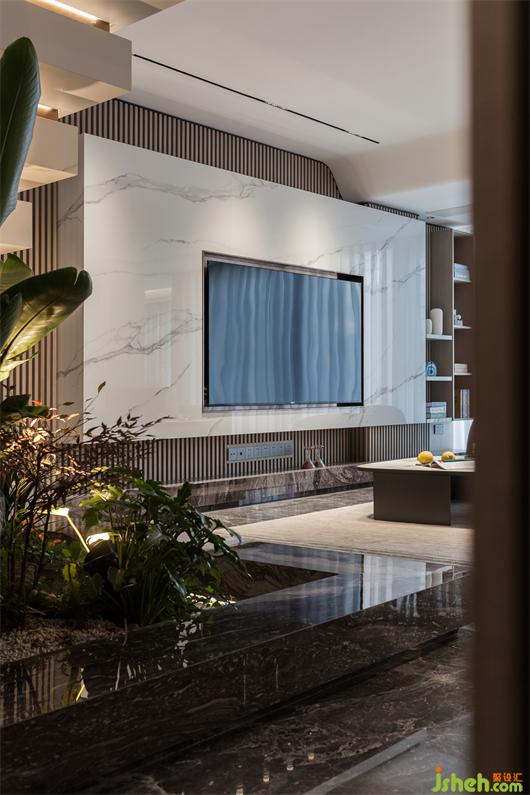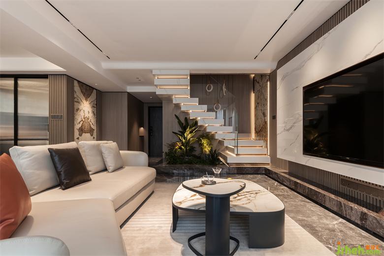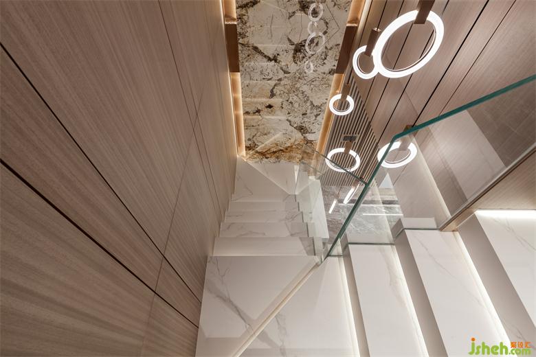 極具質(zhì)感的大理石,精致的金屬線條,高光木飾面板,皮革,絨布,巧妙的搭配,打造出一個舒適、簡練、奢華、溫馨、明亮的居住空間。一樓主要作為休閑娛樂的區(qū)域,在設(shè)計上,我們更多的去打開空間,讓整個空間更具靈動。對于復(fù)式樓來講,樓梯是設(shè)計的核心位置,通過對空間大膽的改造,合理的打造出精美的懸浮式樓梯。巖板作為當下的主流,極致的質(zhì)感追求,盡顯他的與眾不同,在背景墻、樓梯、吧臺等位置巧妙的運用,通過局部精致的金屬線條的合理搭配,共同打造空間質(zhì)感。 染色墻板的結(jié)合給空間增添了許多溫度,更有家的溫馨。地面采用了灰色大理石,自然的紋理給了更多想象的空間。局部奢石的點綴更給空間增加了奢華感。在于空間的設(shè)計當中,簡的存在主要體現(xiàn)在吊頂上面,在當下的時代,生活節(jié)奏的加快,人們對于簡的追求更加的強烈,在設(shè)計的過程中簡與奢的結(jié)合,使得空間更具漲性。