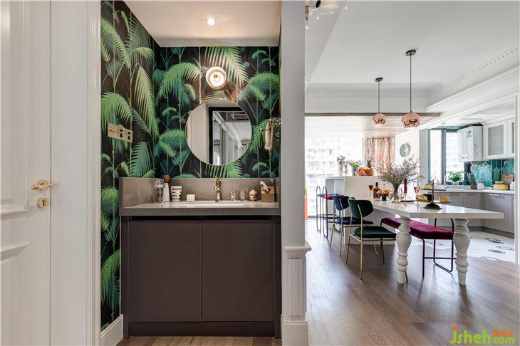 干區(qū)正好在客餐廳的中間過渡區(qū)域,我們將其融合到客餐廳里,選用了英國Cole&Son 進(jìn)口墻紙棕櫚樹,型號是:墨綠色 95/1003。