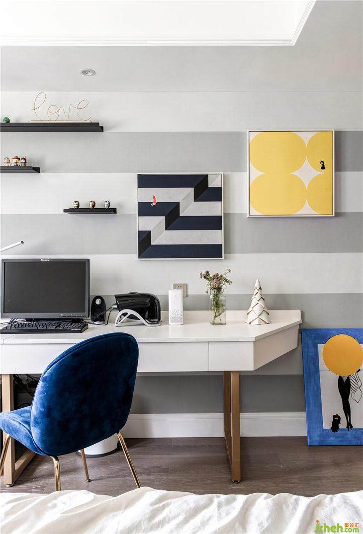 這里空間雖小,但一樣有著大大的儲藏空間,打開房門,是兩個整面的儲物柜,書桌也是很寬很長,防止桌角對外,會有一定的安全隱患和視覺壓抑,我們將桌角斜角處理。