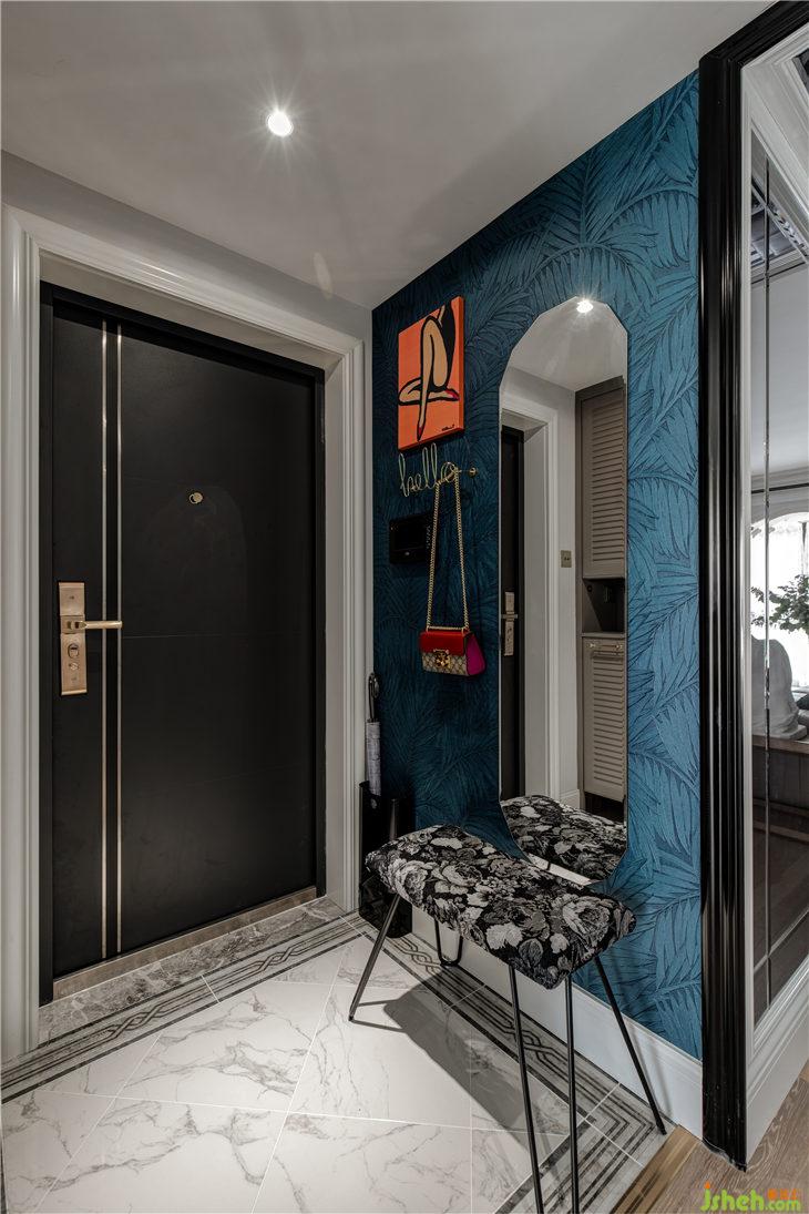 開門入戶,時(shí)尚混搭氣息撲面而來,左手邊是比利時(shí)arte進(jìn)口墻紙,圖紋是熱帶雨林的葉子,深藍(lán)的靜謐與凹凸有致的紋理搭配時(shí)尚跳色掛畫,金色英文字母“hello”掛鉤,右邊棱角分明的全身鏡,地面是經(jīng)典法式花紋圍邊,右邊扣線門板加百葉門板的組合配上精致復(fù)古的把手,野獸派獨(dú)特花紋的細(xì)腿長(zhǎng)凳,每一個(gè)細(xì)節(jié)都將精美質(zhì)感伶俐體現(xiàn),一個(gè)時(shí)尚復(fù)古的混搭之家,就這樣映入眼簾……