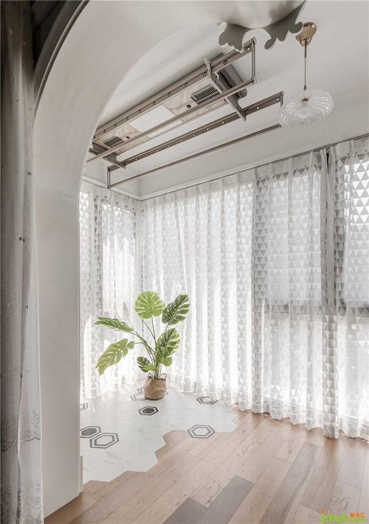 透過心型大門套,地板直鋪到落地窗下口,這邊也自然過渡了跟廚房一樣的六角磚,頂上是生活晾曬區(qū)域,透過幾何半透的落地紗簾,綠植在這里也可以吸收溫暖的陽(yáng)光。