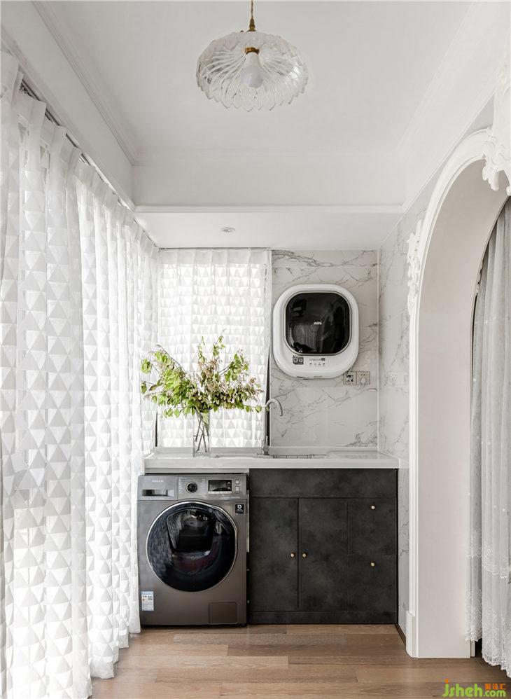 晾曬區(qū)對(duì)面是壁掛的小洗衣機(jī)和一體化洗衣池,墻面是魚肚白紋理瓷磚,門板是復(fù)古的仿巖板材質(zhì),將功能區(qū)也很好的融入了半開放的客廳空間。
