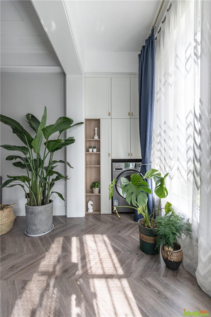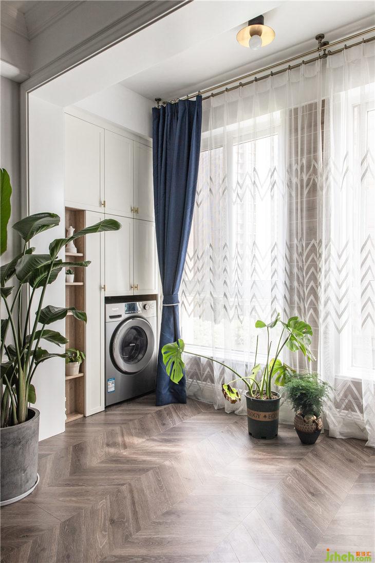客廳和陽(yáng)臺(tái)之間用門(mén)套分割,模糊兩個(gè)空間的界限。地板從門(mén)廳一路鋪到陽(yáng)臺(tái),使得空間之間有了互動(dòng)性。儲(chǔ)藏柜整體定制,將洗衣機(jī)嵌入其中,形成微妙的平衡。