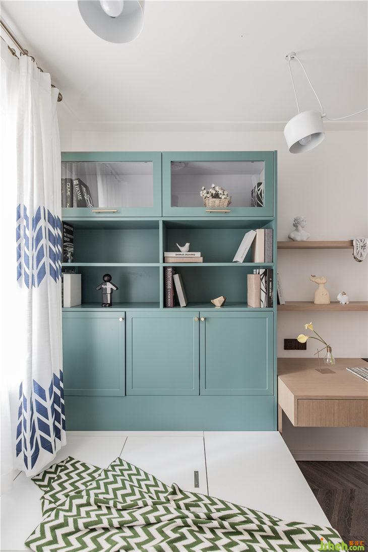 藍(lán)色的小收納柜,成為這個小空間的吸睛點,分層的拼色窗簾,依舊是空間的亮點。