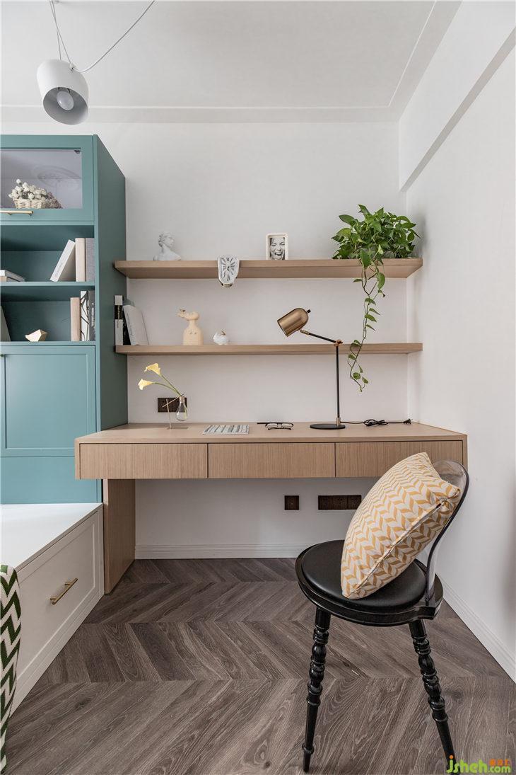 書桌和書架均是現(xiàn)場制作,淺木色kd板飾面,無支撐架和無把手的抽屜,整潔干凈。