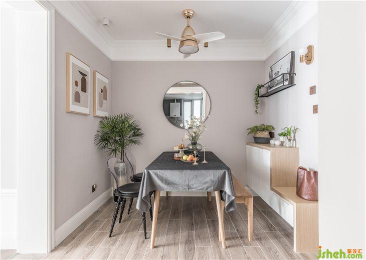 入戶空間并不寬裕,但是要解決就餐和入戶的收納問題,設(shè)計師將鞋柜和餐邊柜完美結(jié)合在一起。餐廳區(qū)域的吊頂和墻面的設(shè)計都盡量簡單 ,簡潔的掛邊配上石膏線條 ,墻面是淡淡的咖色乳膠漆,使空間明亮溫馨。各種金屬質(zhì)感的燈具,豐富這個小小的空間。