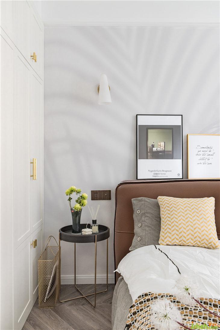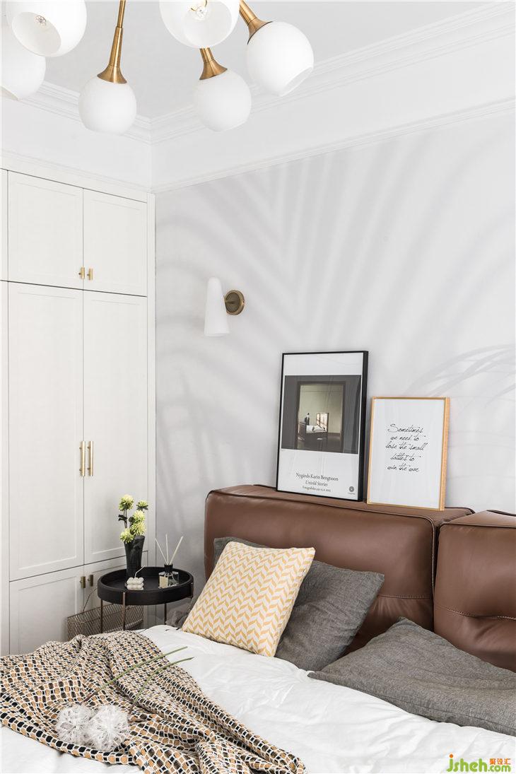 令人舒適的主臥空間,沒有過多的裝飾表現(xiàn),淡淡的枝葉剪影素色壁畫,大面積留白的墻面,為的是一份慵懶撒入室內(nèi)的陽光及那還在追逐的夢想。