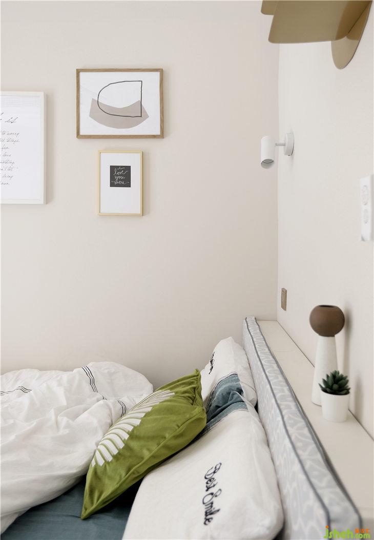 次臥空間不大,與南陽臺相同,采光充裕。放置了一米五的床,定制了一個(gè)窄衣柜,就已經(jīng)充滿了房間;因此我們墻面選用了清新淡雅的白鷺色乳膠漆,搭配暴風(fēng)雨灰色系床品,點(diǎn)綴雪松綠抱枕,讓空間盡量的明亮清爽,單配精選的墻面掛飾和吊扇燈,簡約而又富有生活趣味。