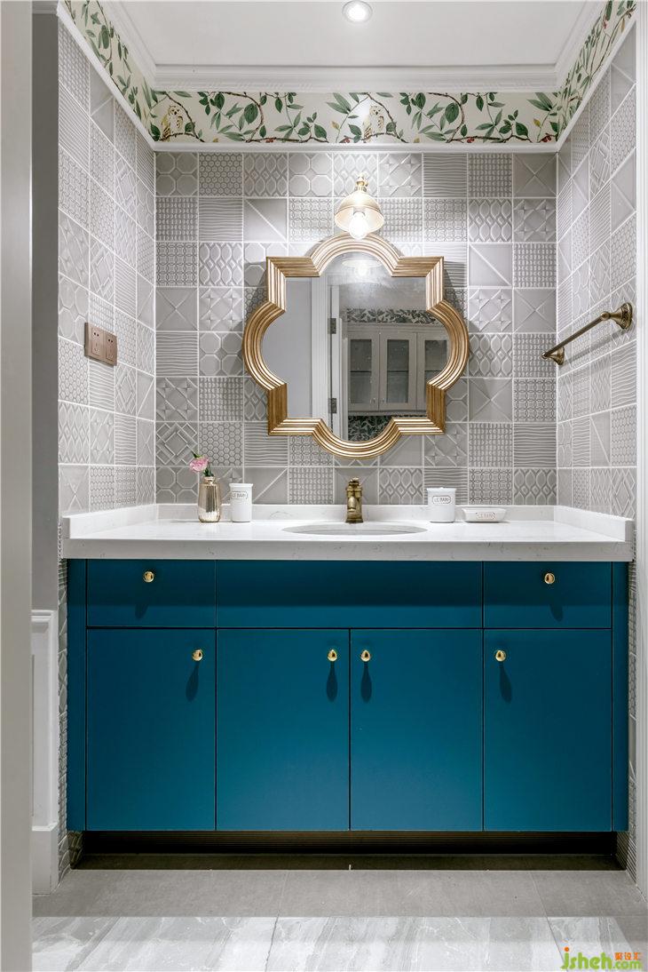三個(gè)層次的分隔,一直順延到干區(qū),中間段用美式小浮雕磚做干區(qū)主背景維和式的鋪貼,古銅色壁燈、龍頭、掛件,小細(xì)節(jié)中體現(xiàn)美式復(fù)古韻味,花型裝飾鏡作為中心主背景,提升整體精致度。