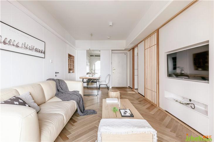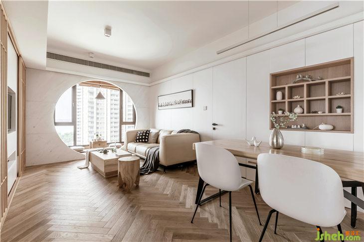 客廳地面鋪設(shè)人字地板,門套以及移門皆使用和室風(fēng)格的木質(zhì)材料,沙發(fā)背景墻白色護(hù)墻,豎向抽縫,與主臥門材質(zhì)統(tǒng)一,融為一體;客廳陽臺飄窗,是最佳的觀景空間,我們將飄窗打造為一個休閑空間,讓這里成為品茶閱讀的休閑觀景臺。