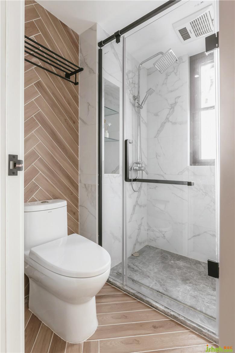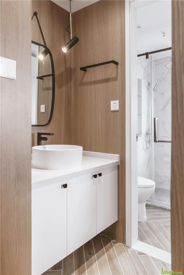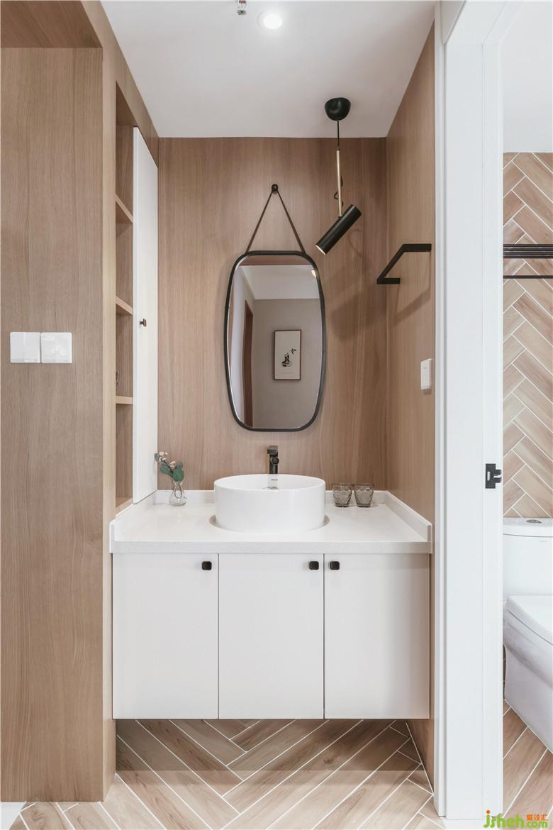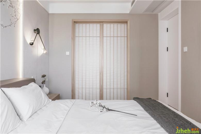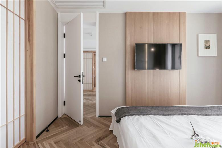 客廳地面鋪設(shè)人字地板,門套以及移門皆使用和室風(fēng)格的木質(zhì)材料,沙發(fā)背景墻白色護墻,豎向抽縫,與主臥門材質(zhì)統(tǒng)一,融為一體