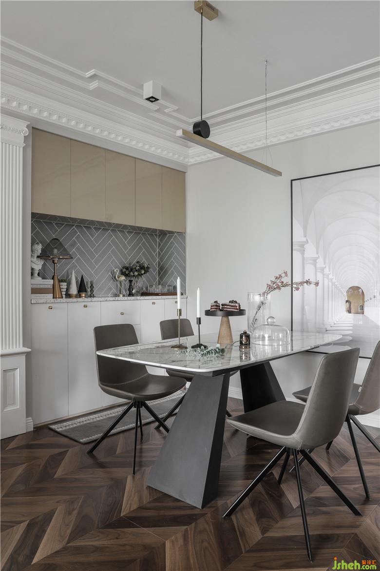 客餐廳保留原始空間,餐廳側(cè)墻取消,餐邊柜內(nèi)置,增加便捷功能性。