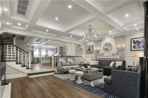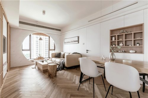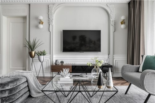 客廳頂部的十二宮格造型增加了空間的層次,同時巧妙的隱藏了原始建筑梁體和出風(fēng)口。沙發(fā)背景以簡約的美式壁爐為背景墻,背景墻下半部分為白色護墻,上半部分為灰色乳膠漆飾面,不同層次之間的微妙變化更顯精致。家具、抱枕、陳設(shè)品色調(diào)統(tǒng)一和諧,靜謐美好。