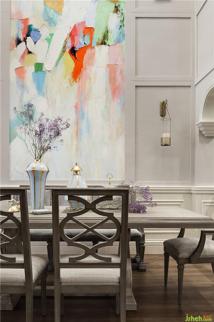 餐廳的家具,來自美克美家ART系列,米灰色調(diào)的復(fù)古美式風(fēng)格,褪去了傳統(tǒng)美式家具冗雜的造型,與我們經(jīng)典美式硬裝基調(diào)完美的融合。