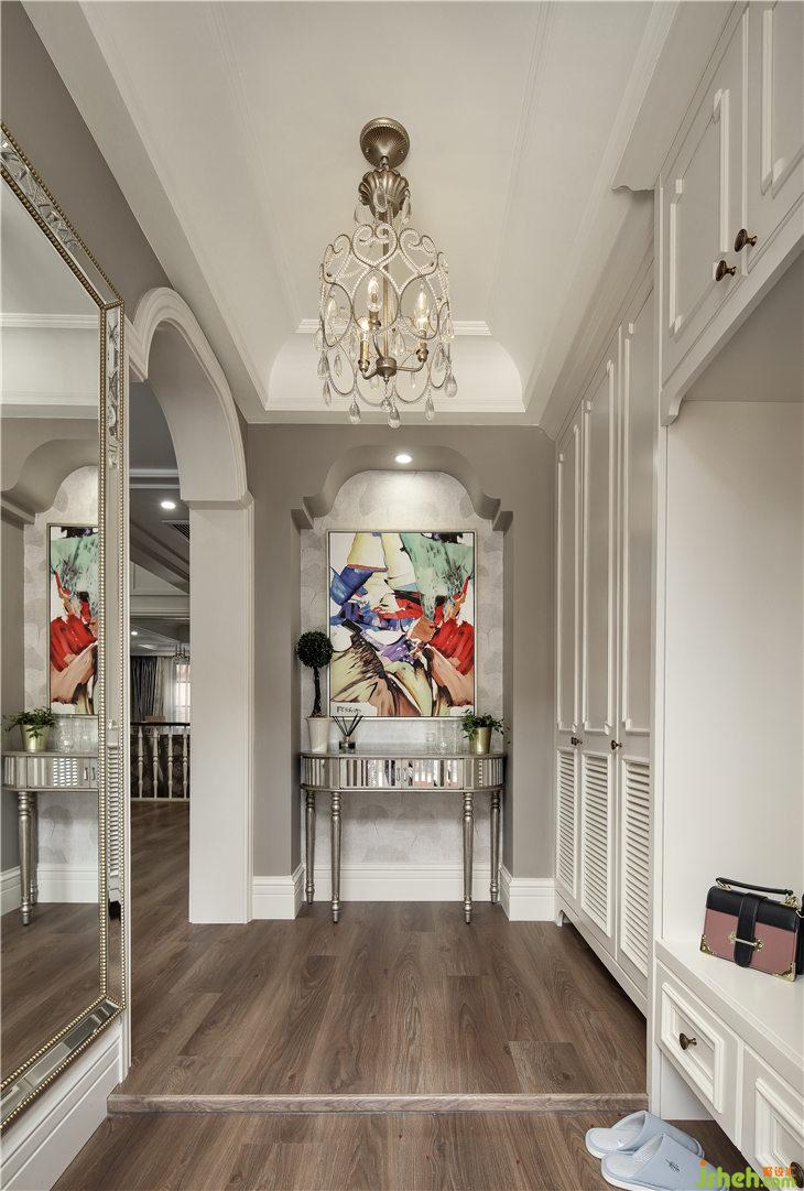 入戶玄關(guān),頂面內(nèi)凹的穹頂造型增加了視覺高度,墻面用了灰咖色的乳膠漆奠定了整棟別墅的淡雅基調(diào),玄關(guān)造型運(yùn)用了經(jīng)典的門套弧線。內(nèi)置的彩色油畫,抽象而又靈動(dòng)。玄關(guān)地面設(shè)計(jì)了高差,換鞋區(qū)下沉,形成不同的高度體驗(yàn),也劃分了視覺面積。