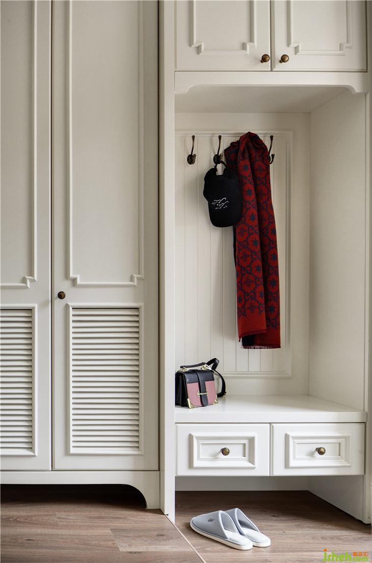 右手邊設(shè)計(jì)了鞋柜和換鞋凳的組合,下方挑空,常用的鞋,可以直接儲(chǔ)放,臨時(shí)的衣帽隨手懸掛。左手邊設(shè)計(jì)了穿衣鏡,出門時(shí),整理下衣著就可以美美的出門啦。