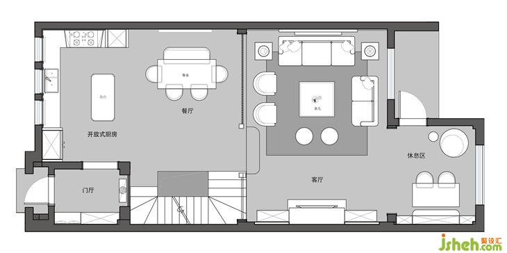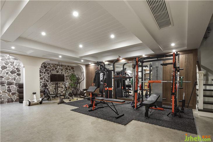負(fù)一樓是業(yè)主運(yùn)動(dòng)健身的天地。采光井一側(cè)的墻面采用了自然文化石貼面,引入了戶外感覺;另側(cè)墻面用復(fù)古木飾面結(jié)合鏡面裝飾,拓展空間,同時(shí)讓地下室更加明亮。