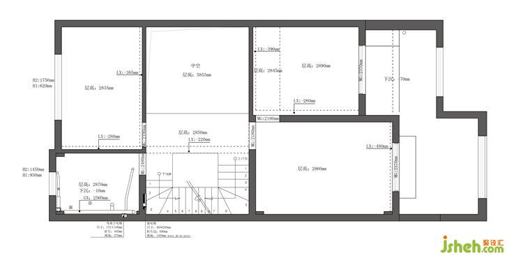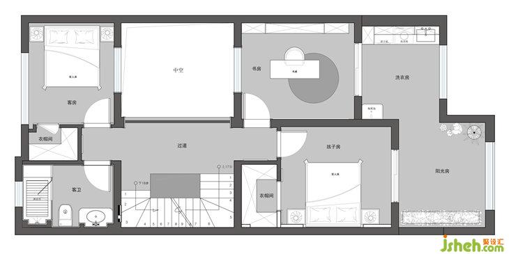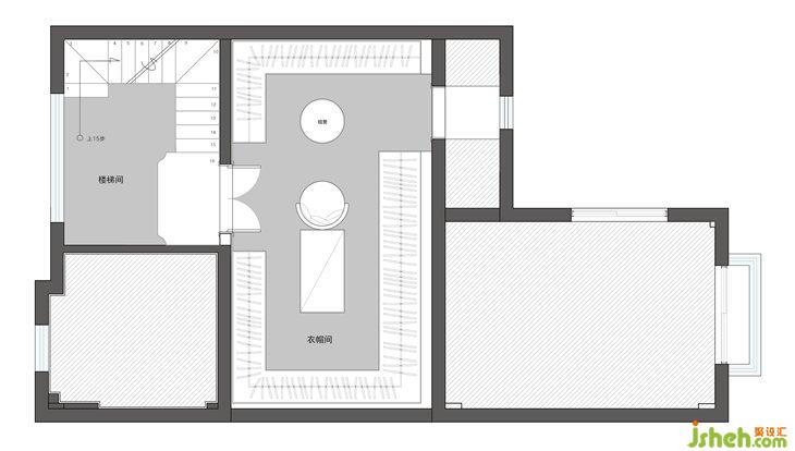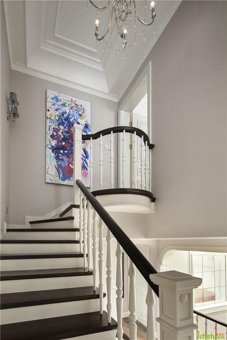 通往三樓主臥室的樓梯,以石膏板疊級(jí)增加吊頂層次,增加了樓梯間穹頂?shù)囊曈X高度。墻面灰色乳膠漆與吊頂進(jìn)行分色。房門外的樓梯平臺(tái),我們進(jìn)行了外加,挑出一個(gè)造型平臺(tái),讓門前的空間更加充足,不顯擁擠。