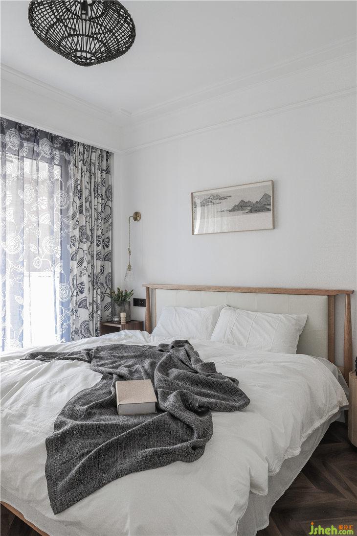 這是爺爺奶奶的房間,用色則是偏向?qū)庫o素雅,以白為主,以凈為輔,白色皮革與原木色結(jié)合的床架,簡約素雅的床飾,藏藍色花紋窗簾,沉穩(wěn)而端莊,更加適合老人。畫家姚永強的經(jīng)典之作-《江南闊》作為背景畫,讓整個空間更加沉靜清透。