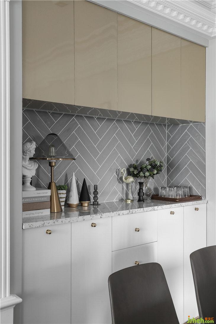 餐邊柜,我們用了分色處理,下柜啞光白色烤漆門板,并單配金色球形小把手,提升精致感,吊柜,我們選用了金屬香檳色門板和柜體,更加易于打理,同時與下柜的把手形成呼應(yīng)。