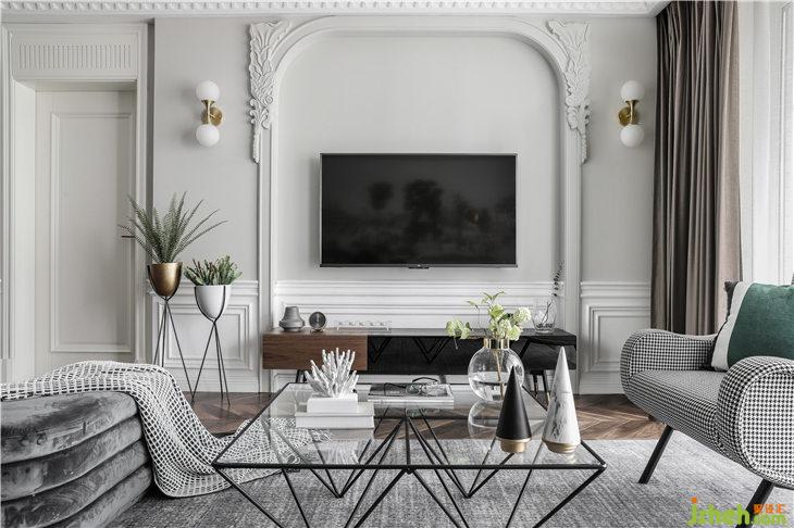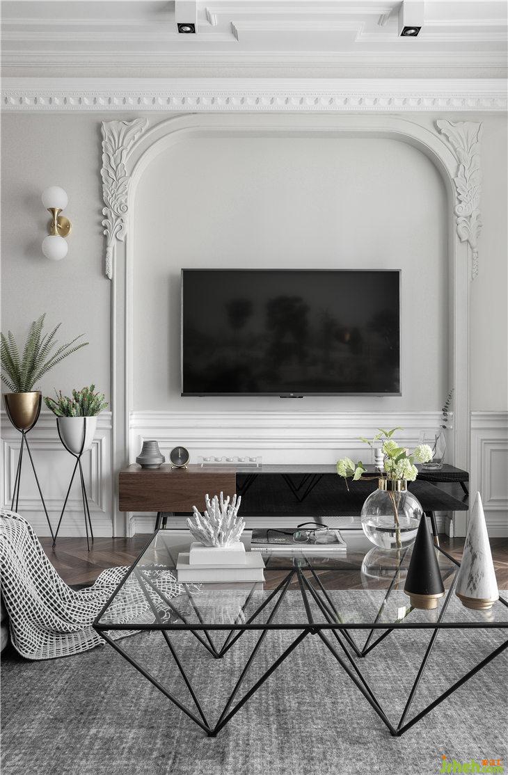 電視背景墻,原始結(jié)構(gòu)的一側(cè)有承重墻凸出,我們將相對一側(cè)同樣加厚拉平,中間形成一個框洞,使用PU線條進(jìn)行裝飾結(jié)合拱形角,扣上我們定制雕刻的一對石膏花角線(花角一個500大洋,電腦雕刻,只此一對),讓墻面更加豐富與生動。