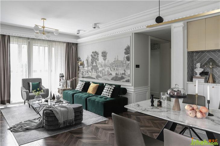 客廳的軟裝選擇上,我們用了經(jīng)典祖母綠的絲絨沙發(fā),搭配現(xiàn)代經(jīng)典造型的千鳥格單人沙發(fā)和灰色絨面弧形榻凳,營造了整體大氣卻不失精致感的雅致韻味。吊頂與電視背景墻壁燈,選用了同系列樣式,香檳金屬結(jié)合白磨砂燈泡,增添了高雅的氣質(zhì)。