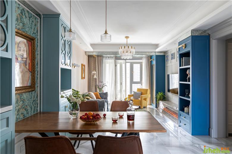 客廳整體色彩層次豐富,但遵循統(tǒng)一呼應(yīng),沙發(fā)背景選用粉色壁紙,電視背景選用與餐廳淺藍(lán)色柜體同色系的深藍(lán)色,主吊燈與餐廳吊燈材質(zhì)統(tǒng)一,與陽臺(tái)間下掛的建筑主梁,低于吊頂高度,而且較寬,區(qū)域相對(duì)壓抑,這里使用了車邊仿古鏡包裹,讓空間打開。