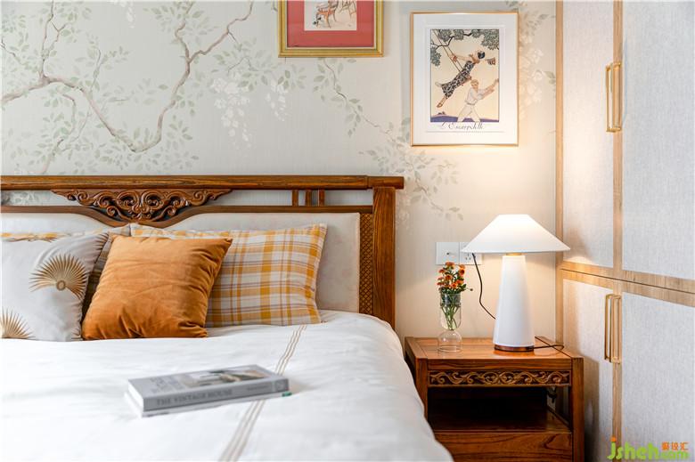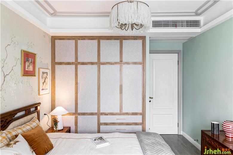 主臥的衣柜柜門,特別設(shè)計(jì)定制,木色邊框,布藝感飾面,與紅木家具配合使用。