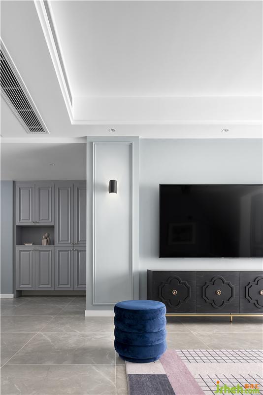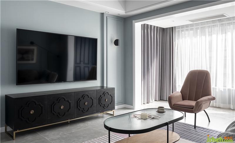 電視墻同樣以簡潔的石膏線為主,結合深色的電視柜,更為和諧。綠植的點綴也是一大亮點,為這個家?guī)砹藷o限的生機與活力。