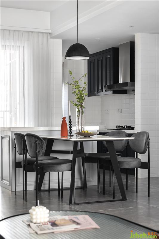 餐桌椅簡約而不簡單,深色的結構有著美式獨有的沉穩(wěn)氣質。線條感十足的美式柜子,再輔以裝飾畫和桌面的綠植插花,就餐氛圍瞬時優(yōu)雅起來。