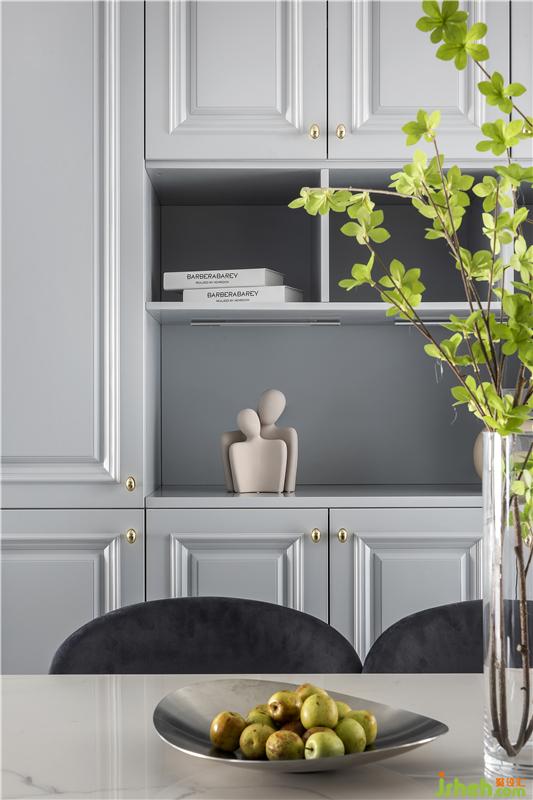 餐廳與生活陽臺相連,采光十分通透。餐柜的設計,不僅解決了最基本的收納問題,而且還提前預留了一個冰箱位,加上利用矮柜布置的操作臺,實現(xiàn)了強大的使用功能。