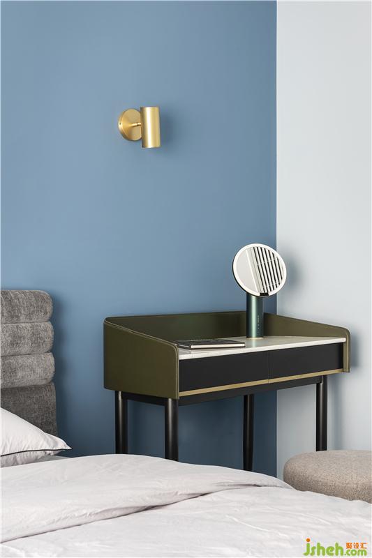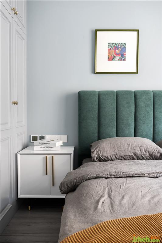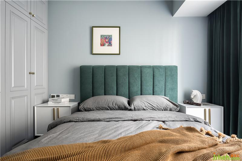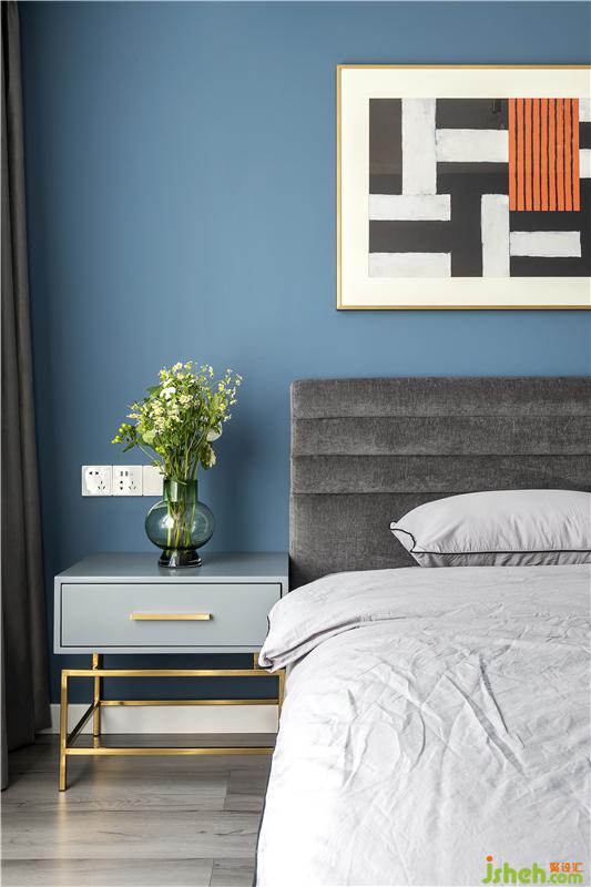 藍(lán)色的背景墻加上簡約的裝飾畫,清新而大氣。深色的簡約大床呼應(yīng)睡眠空間的整體風(fēng)格,更顯穩(wěn)重大方。