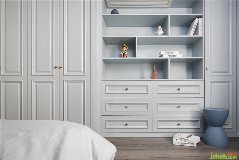 次臥空間風(fēng)格與主臥相呼應(yīng),整個空間設(shè)置了大面積的柜子,充分滿足屋主的收納需求。