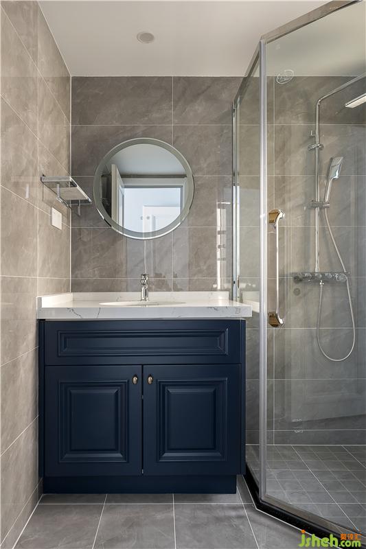 衛(wèi)浴空間墻面鋪滿魚骨形狀瓷磚,結(jié)合圓鏡和藍(lán)色的抽屜柜,優(yōu)雅之感應(yīng)運(yùn)而生。
