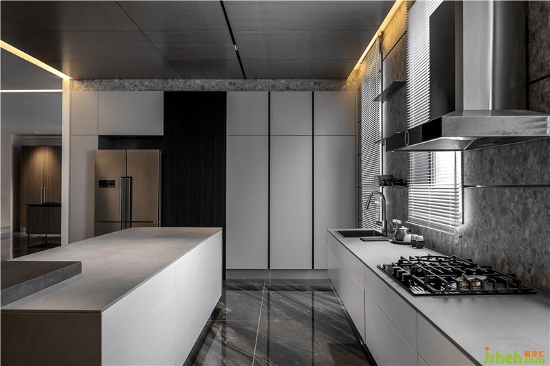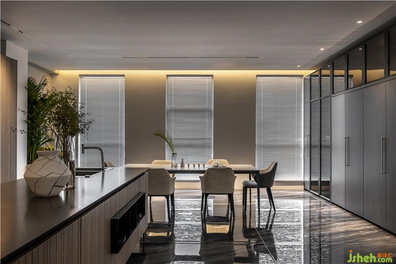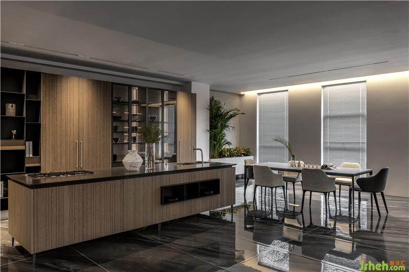 頂面平吊拉通視角,木質(zhì)櫥柜與黑色大長磚恰到好處的呼應(yīng),更能彰顯大氣沉穩(wěn)的現(xiàn)代居住空間。