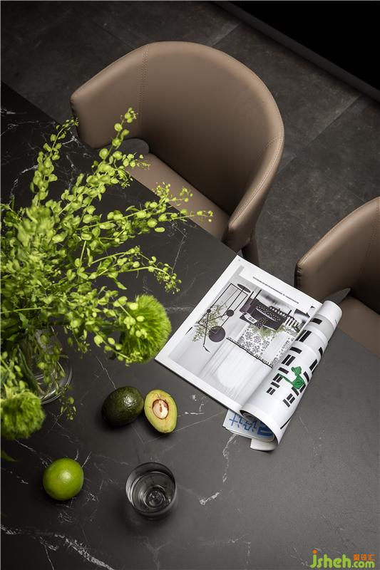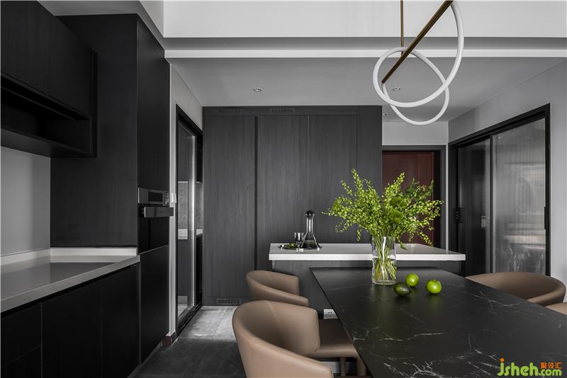 餐廳與西廚結(jié)合在一起,餐桌連接島臺(tái),方便操作,也增加時(shí)尚感