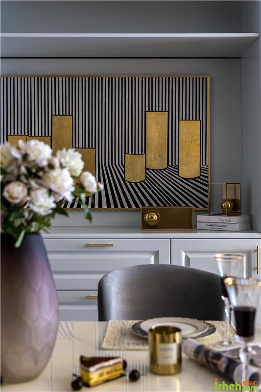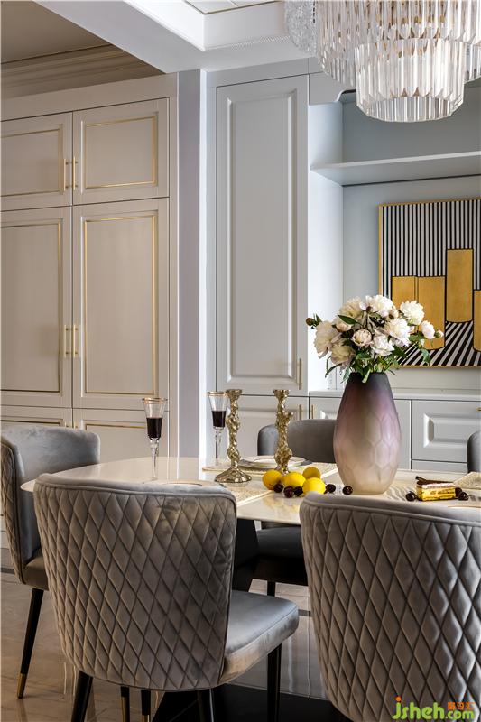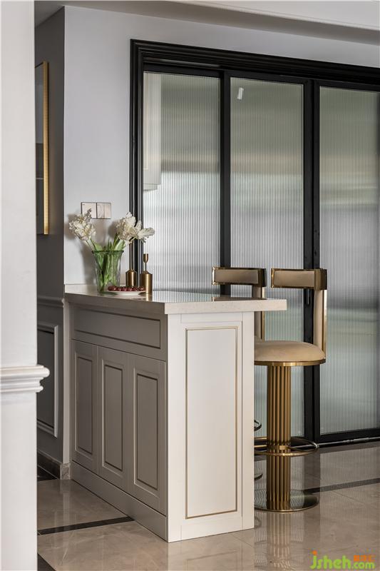 中廚與餐廳用玻璃滑門隔斷,白色的花磚與地磚融為一體,櫥柜的金色線條與餐區(qū)風(fēng)格統(tǒng)一,平衡視覺效果。