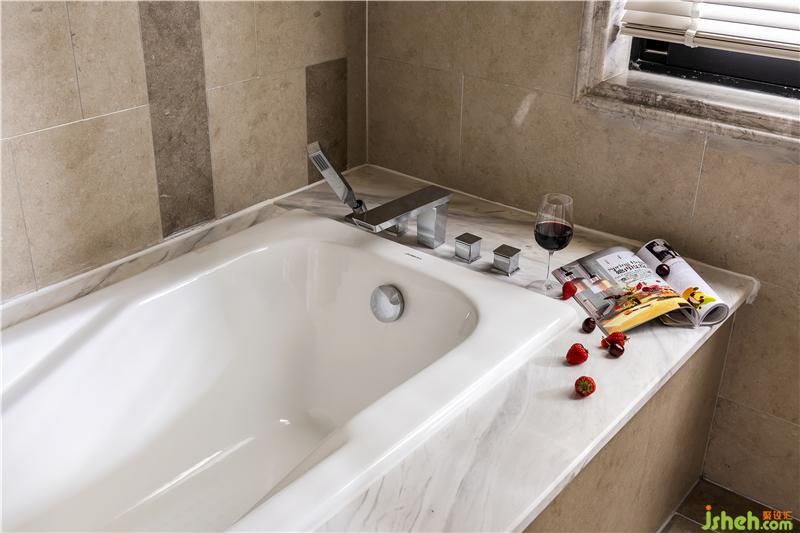 米灰色地磚搭配白色浴柜,營造出簡潔大氣的空間效果。金屬色的浴鏡,增加了空間的奢華格調(diào),花邊造型進(jìn)一步演繹著法式的浪漫與優(yōu)雅。