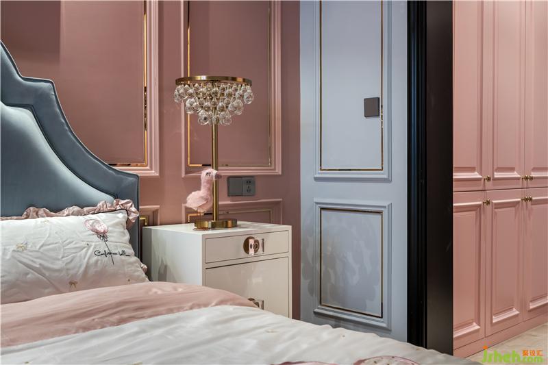 女兒房是精致夢(mèng)幻的,背景色是比主臥淺一點(diǎn)的藕粉,搭配灰藍(lán)色的床,溫柔的色彩為空間增添了寧靜。