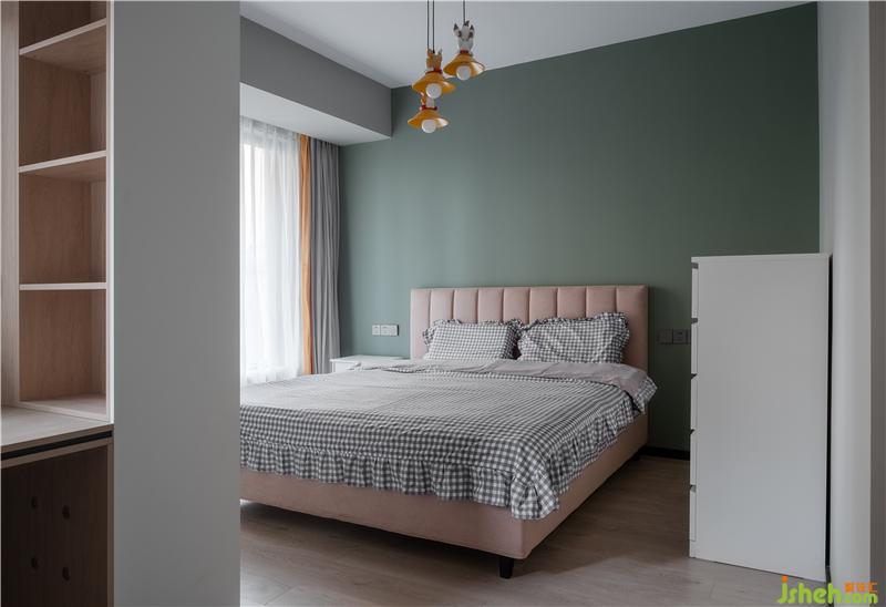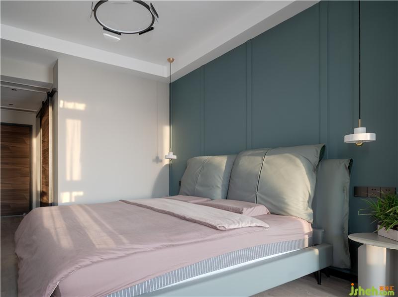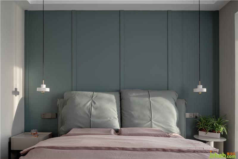 臥室寬大的床上鋪著柔軟舒適的床上用品,床頭背景墻沒有過多的裝飾,只是鋪滿了淡雅的藍色乳膠漆。造型簡約的床頭柜上擺放著臺燈和常用物品,室外的陽光透過玻璃窗灑進來,讓整個臥室都沐浴在陽光下,給人一種明亮溫暖的感覺。