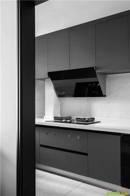 l型廚房沿用了大理石瓷磚,搭配灰色櫥柜,層次分明,視覺上充滿流暢的美感,也增強(qiáng)了廚房的兼容性。