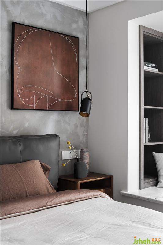 主臥室采用了水泥漆背景墻,胡桃色的裝飾畫與床品相呼應(yīng),皮質(zhì)軟包的床頭造型、黑色的吊燈,為睡眠空間點(diǎn)綴了一些工業(yè)風(fēng),簡(jiǎn)單且富有神秘感。