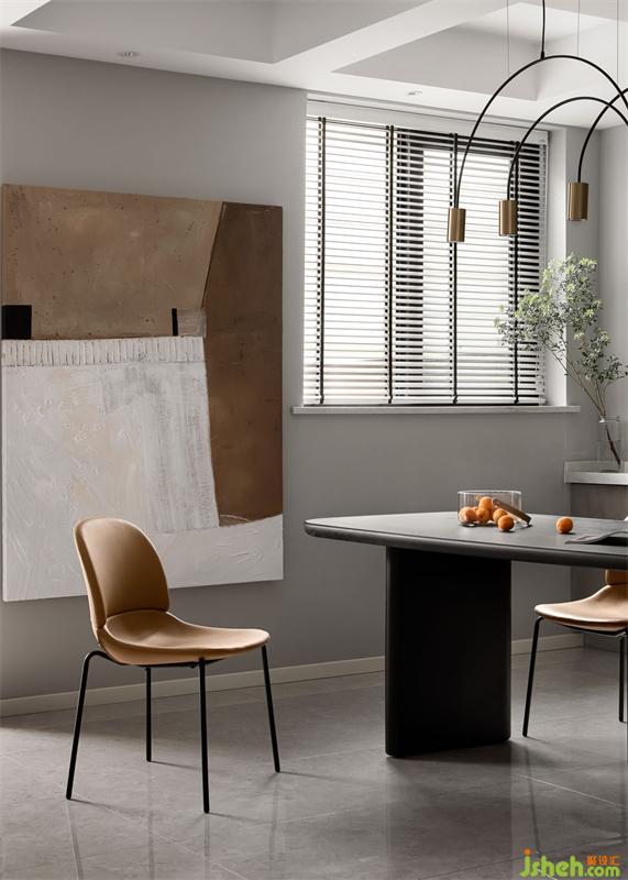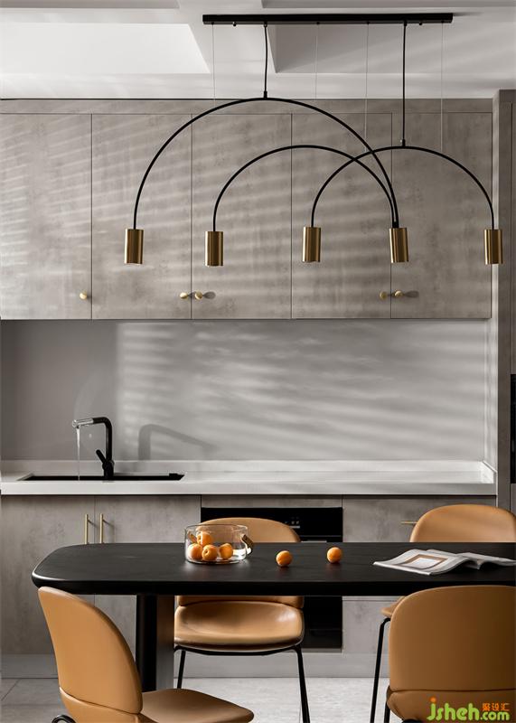 “島臺(tái)+餐桌”的設(shè)計(jì),時(shí)尚又大方,橙色桌椅搭配灰色餐桌,總是會(huì)讓人忍不住多看兩眼,弧形的吊燈,提升了空間的質(zhì)感,簡約不簡單。