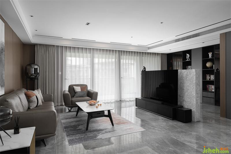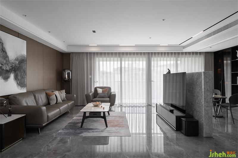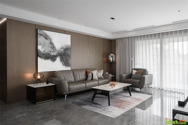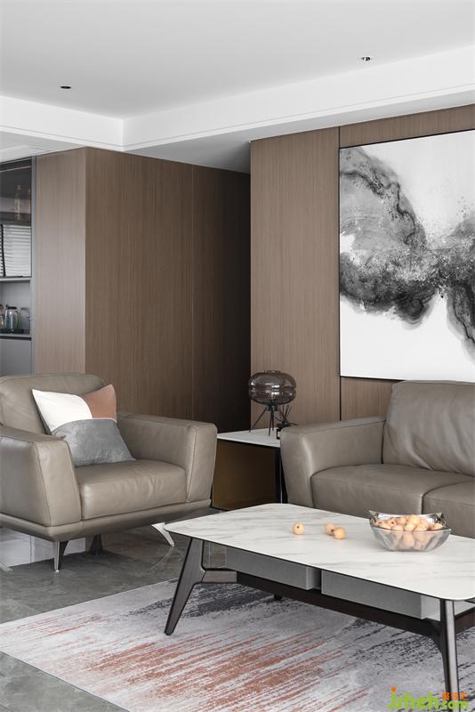 人間燈火無不休,愛于山水與春秋。一漣漣的褶皺窗紗隨著微風(fēng)輕拂,木色的飾面板通鋪整個墻面,灰棕色的皮質(zhì)沙發(fā)與整個客廳融為一體,極具中國風(fēng)的水墨畫躍然紙上,靈動又盡顯張力。
