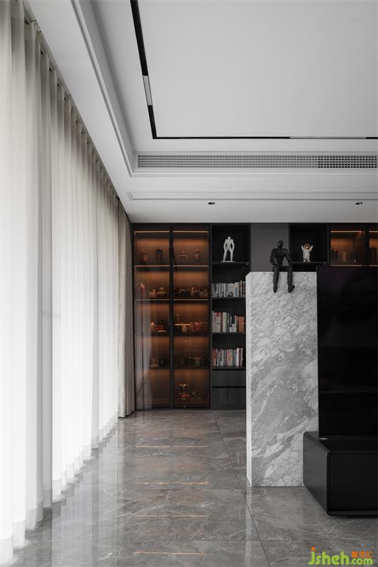 書柜不僅僅有儲物功能,造型各異的擺件更是點綴出了一絲神秘感,純黑色的柜體彌漫著淡淡的高貴氣息。業(yè)主是星巴克杯子的收集愛好者,柜子里藏滿了淘回家的杯子,同時,他也是一個細(xì)心又好客的人,會為來到家的朋友備好專屬的咖啡杯。