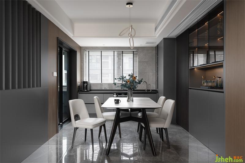 簡約深色的豎柵格板,整齊劃一,既美觀又讓空間質(zhì)感更豐富。通頂?shù)牟瓦吂?,方便放置精致的器皿、餐具、美酒,美觀而實用。