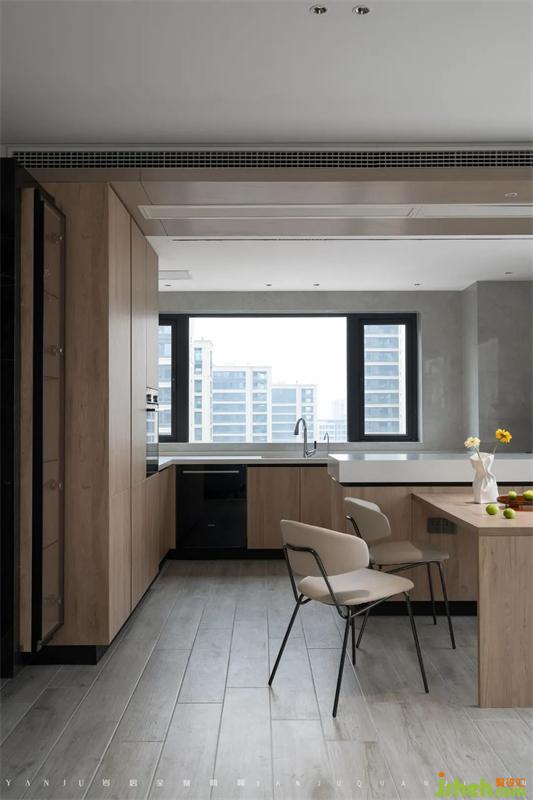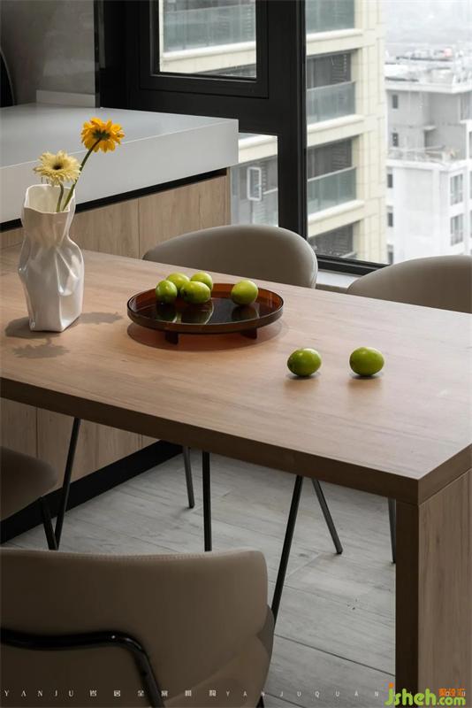內包進來的陽臺做成了全落地窗的形式,一來優(yōu)化采光,二來方便公共區(qū)域的通風。