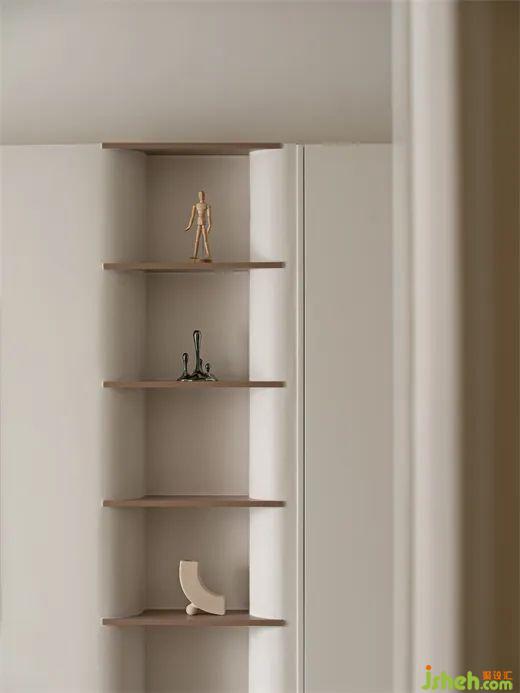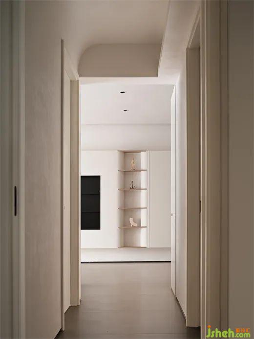 走廊圓弧造型與燈帶的設(shè)計(jì),不壓低層高的同時(shí)滿足了照明、造型,提升了空間的延伸感;而客廳電視背景墻的置物架也為走廊增添了美感。