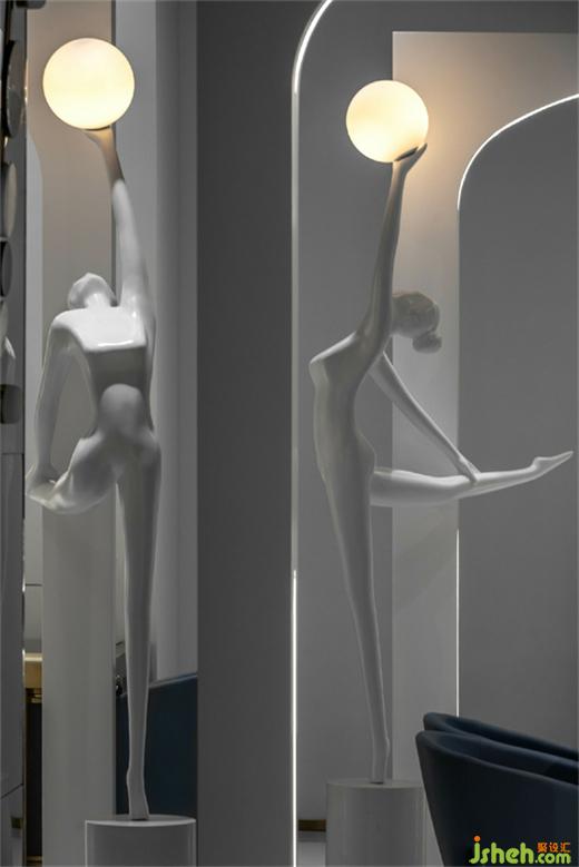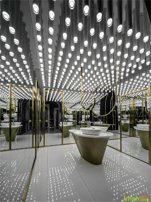 主要材料:鏡面不銹鋼、水波紋板、白色鏡面瓷磚、黑色背漆玻璃、定制烤漆雕塑