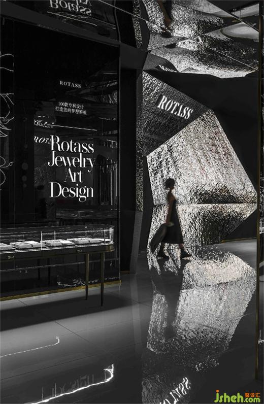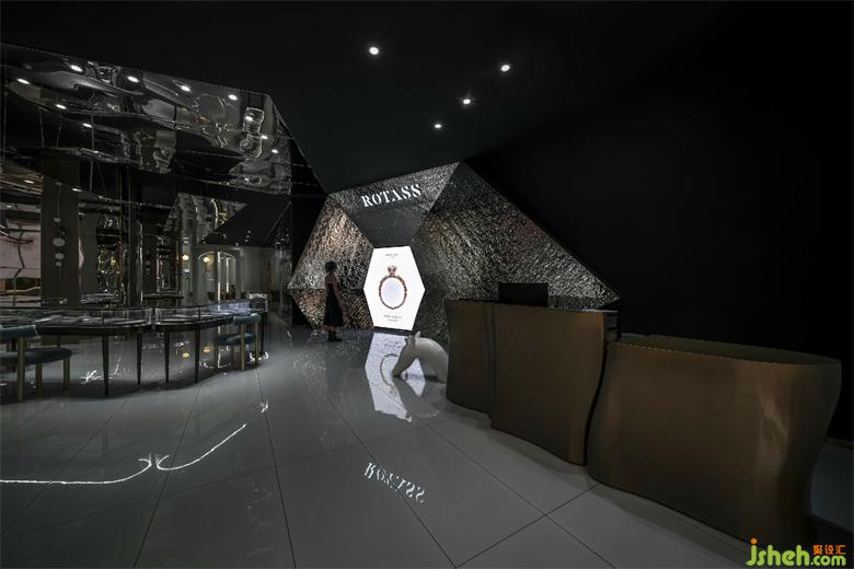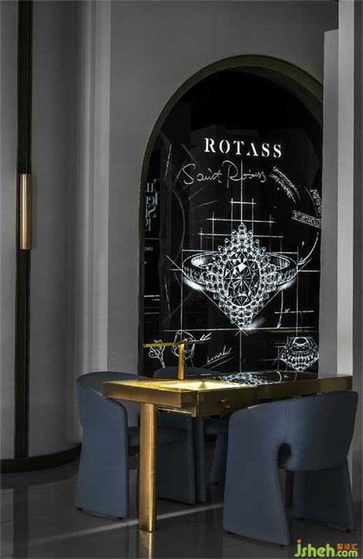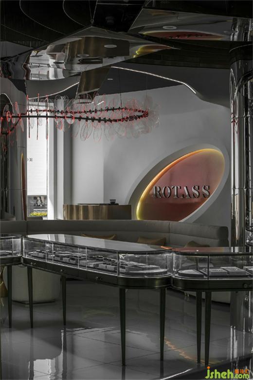 Different from other businesses, jewelry design emphasizes that the store design should interpret the brand attitude and aesthetic spirit with the most accurate language. As for the design of the store appearance, the designer arranges point-shaped LED lights in good order. The highly inlaid decorative technique made the lamp belt look like a shining auxiliary diamond, overflowing with dazzling brilliance, thus highlighting the professional tone of Rotass as a jewelry brand. Meanwhile, the designer sets up the transparent floor glass on a eight-meter-long display wall so that it can extend the graceful indoor scene and narrow the visual distance between people.
